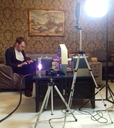Unfortunately with full-time jobs and family responsibilities, finding time to shoot was difficult, and as we wanted to get filming done to start crowdfunding we had a self-imposed deadline looming. As we were unable to schedule a date for filming with Jack before that deadline, Jed stepped in to play the part of Harding. That introduced another set of problems, with Jed living in Narnia: he could only get over to film for one night, and Midnight oil was clearly a two night project. We were going to have to do a lot of prep work for this.
